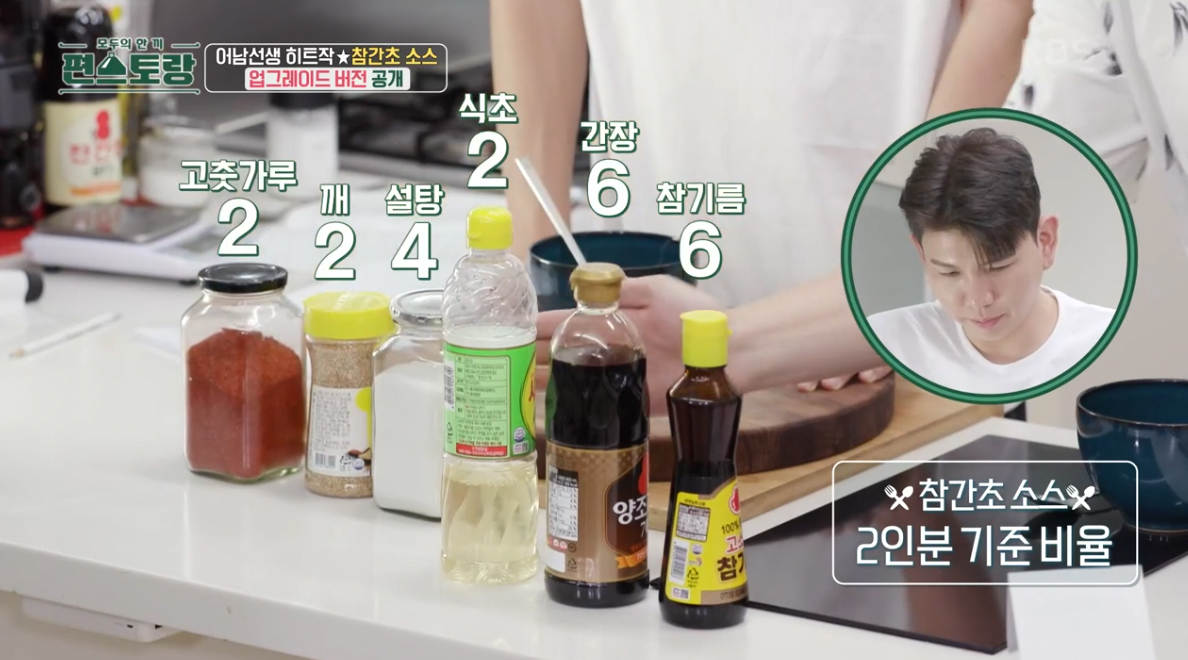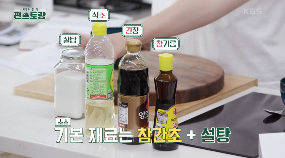 참간초소스 재료 : 참기름, 양조간장, 식초, 설탕, 고춧가루, 통깨 , 물
