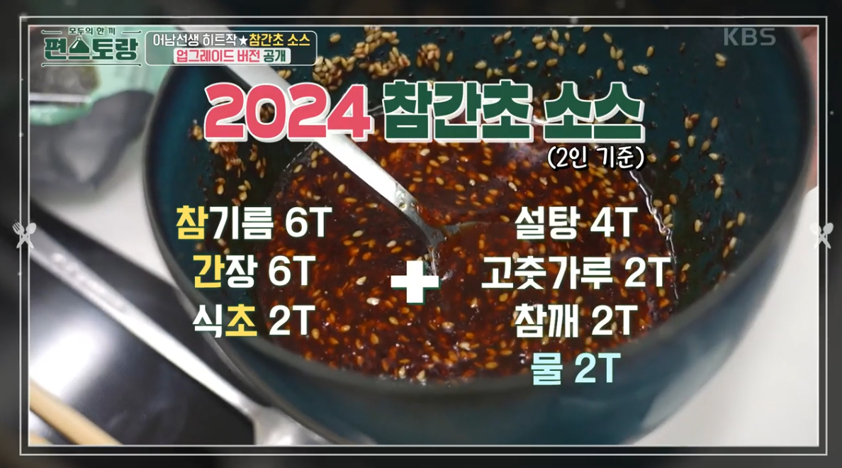 고춧가루 2T, 깨 2T, 설탕 2T, 식초 2T, 간장 3T, 참기름 6T, 물 2T