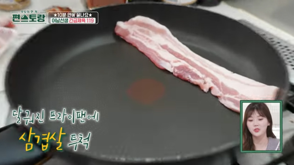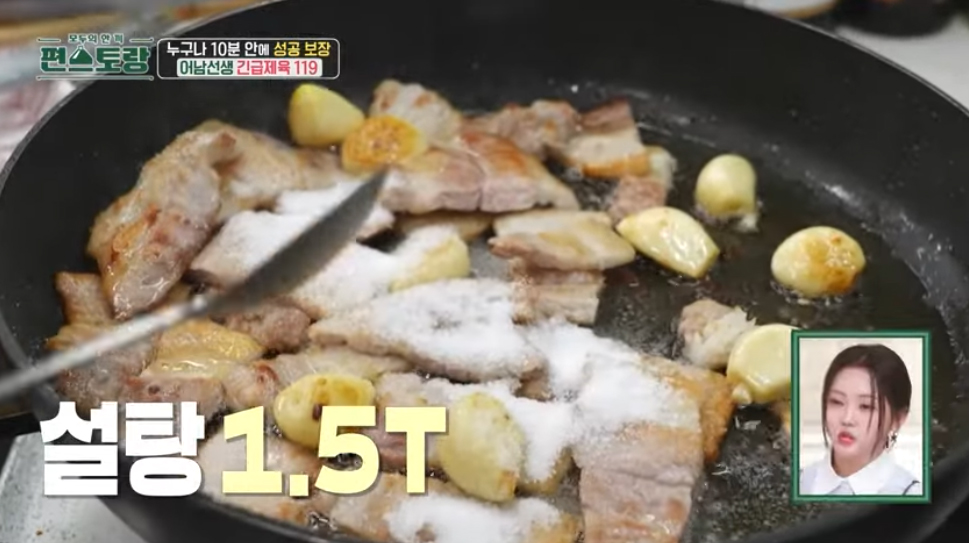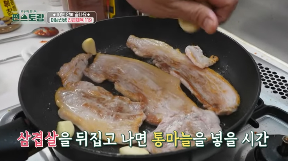 통마늘은 삼겹살을 뒤집은 후에 넣어 주세요.