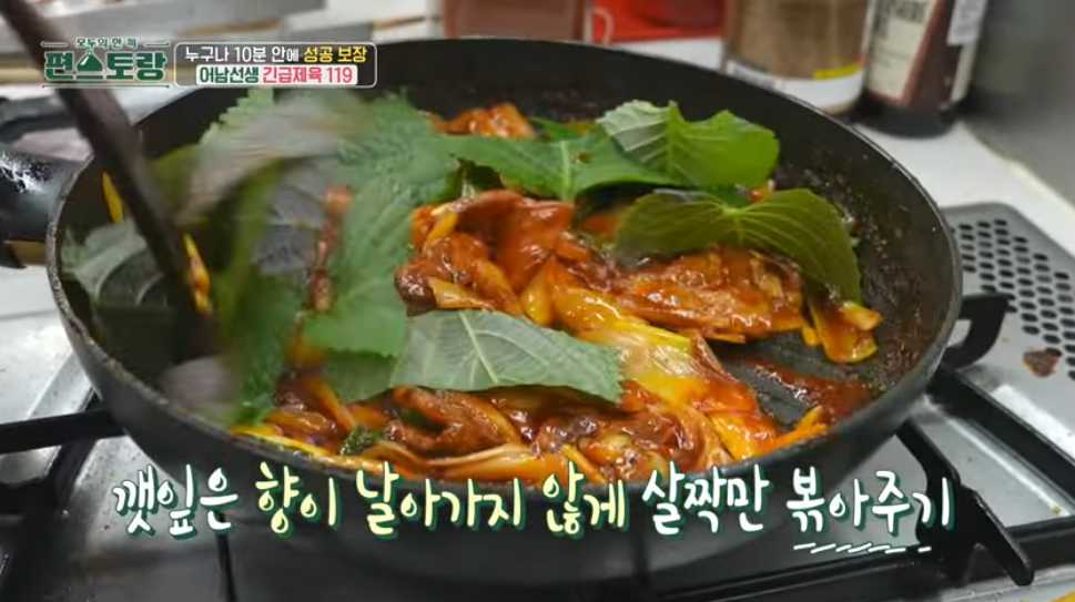 마지막으로 깻잎 넣고 살짝만 볶은 후 약불로 줄이고 뚜껑 덮고 10초 기다리기.