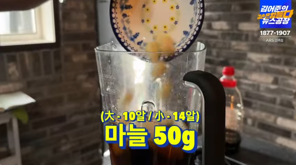 배 1개, 물 3컵, 대흥 불간장 1+1/4컵, 마늘 50g, 설탕 1/2컵, 후추 1/2 스푼을 믹서기에 넣고 갈아주세요.