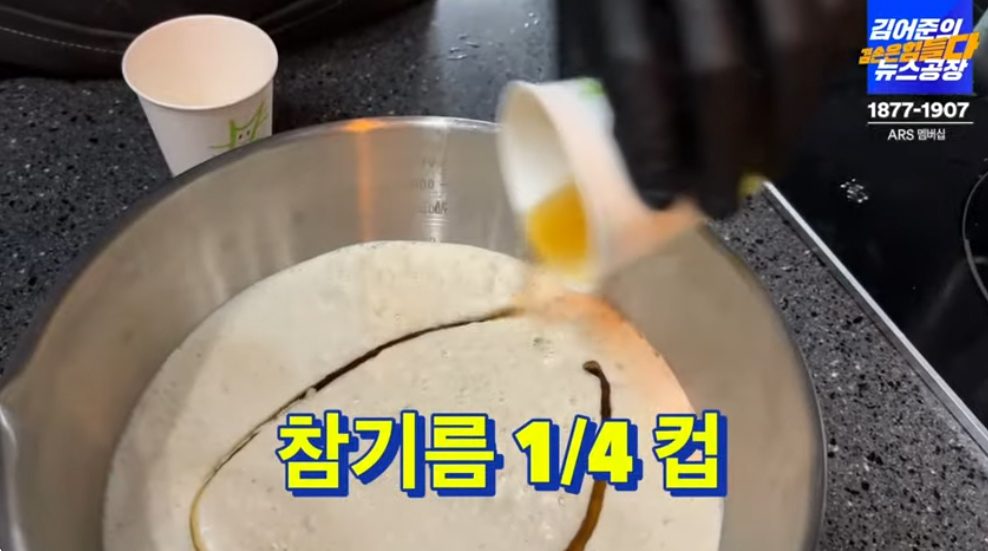 믹서기에 간 내용무을 볼에 담고 청주 1/4컵, 참기름 1/4컵, 깨 2스푼 넣고 섞어 주세요.